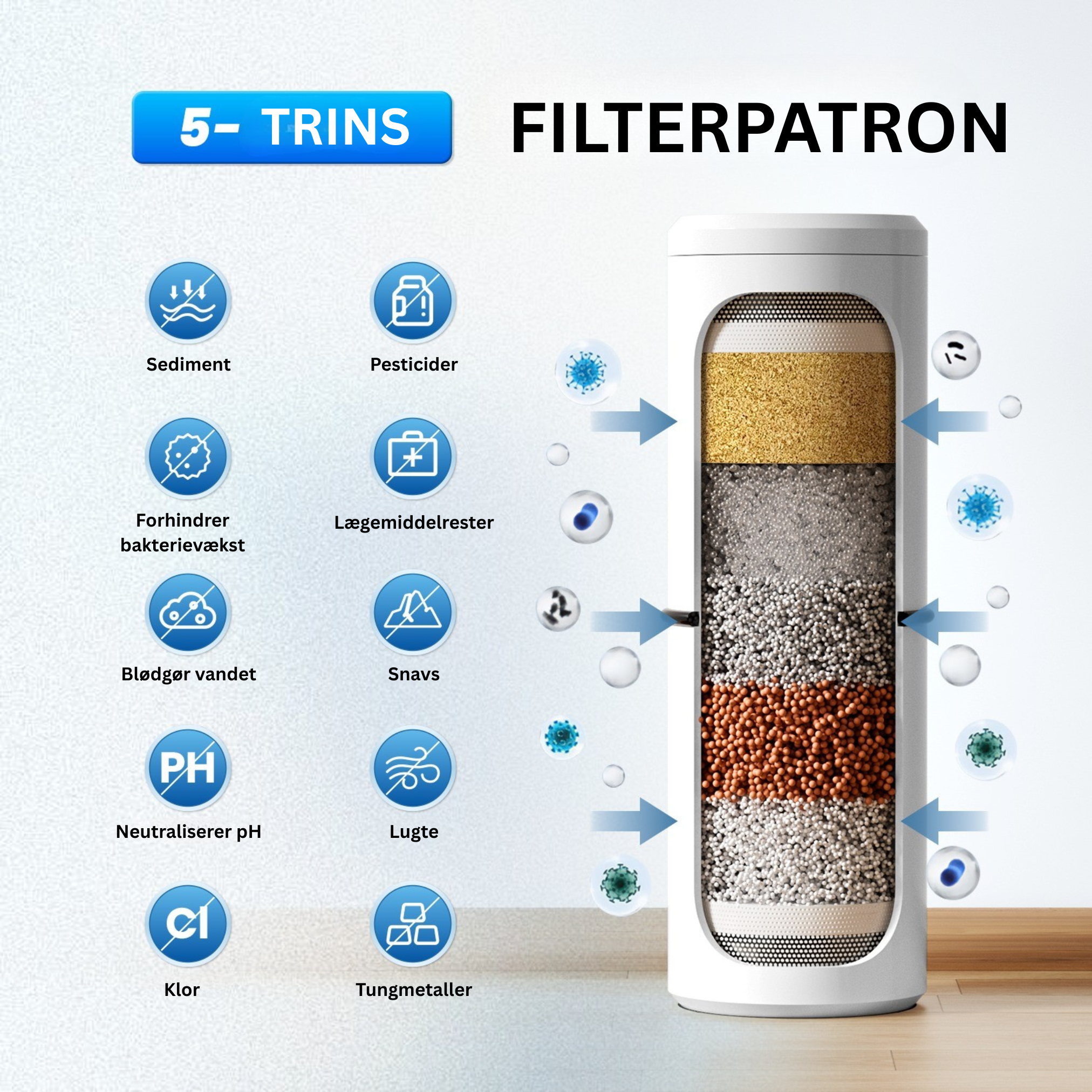 Vandet passerer gennem 5 lag, herunder KDF, kalkbeskyttelse, Vitamin C, Maifan-sten og Calcium Sulfit, som tilsammen fjerner klor, kalk og tungmetaller – og tilfører naturlige mineraler.